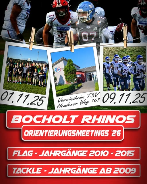 Am Sonntag, den 09.11.25 um 12 Uhr, ebenfalls in der Gaststätte des TSV Bocholts, wird das Programm des Herren-Tackle Teams vorgestellt. Alle volljährigen Interessenten sowie Jugendliche der Jahrgänge 2009 und älter können sich hier einen Eindruck verschaffen, wie die Saison ablaufen wird und einen ersten Kontakt zum Team herstellen.